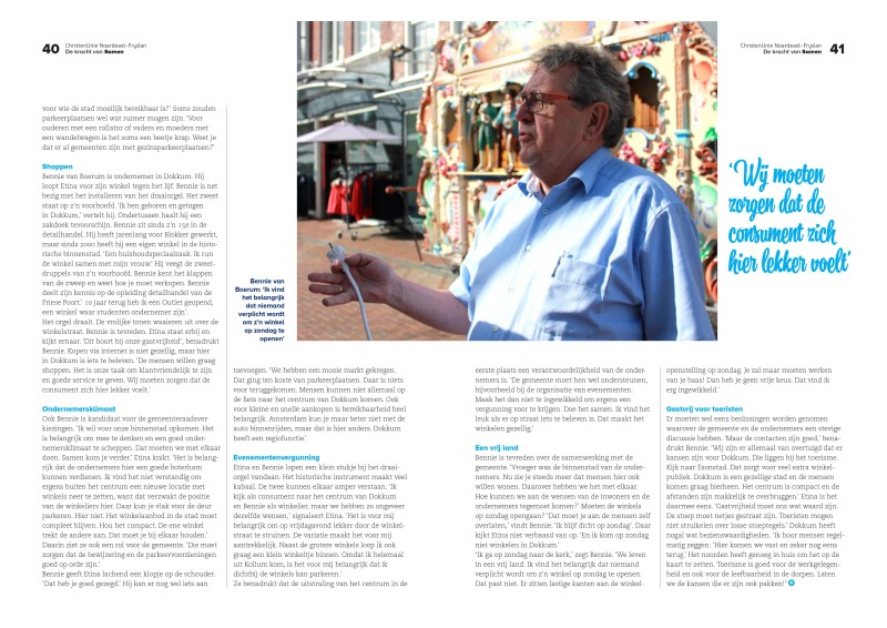 "Hou het winkelcentrum lekker compact." Kandidaat-raadsleden Etina Keegstra en Bennie van Boerum praten in het centrum van Dokkum onder andere over het ondernemersklimaat en de openstelling van winkels op zondag.