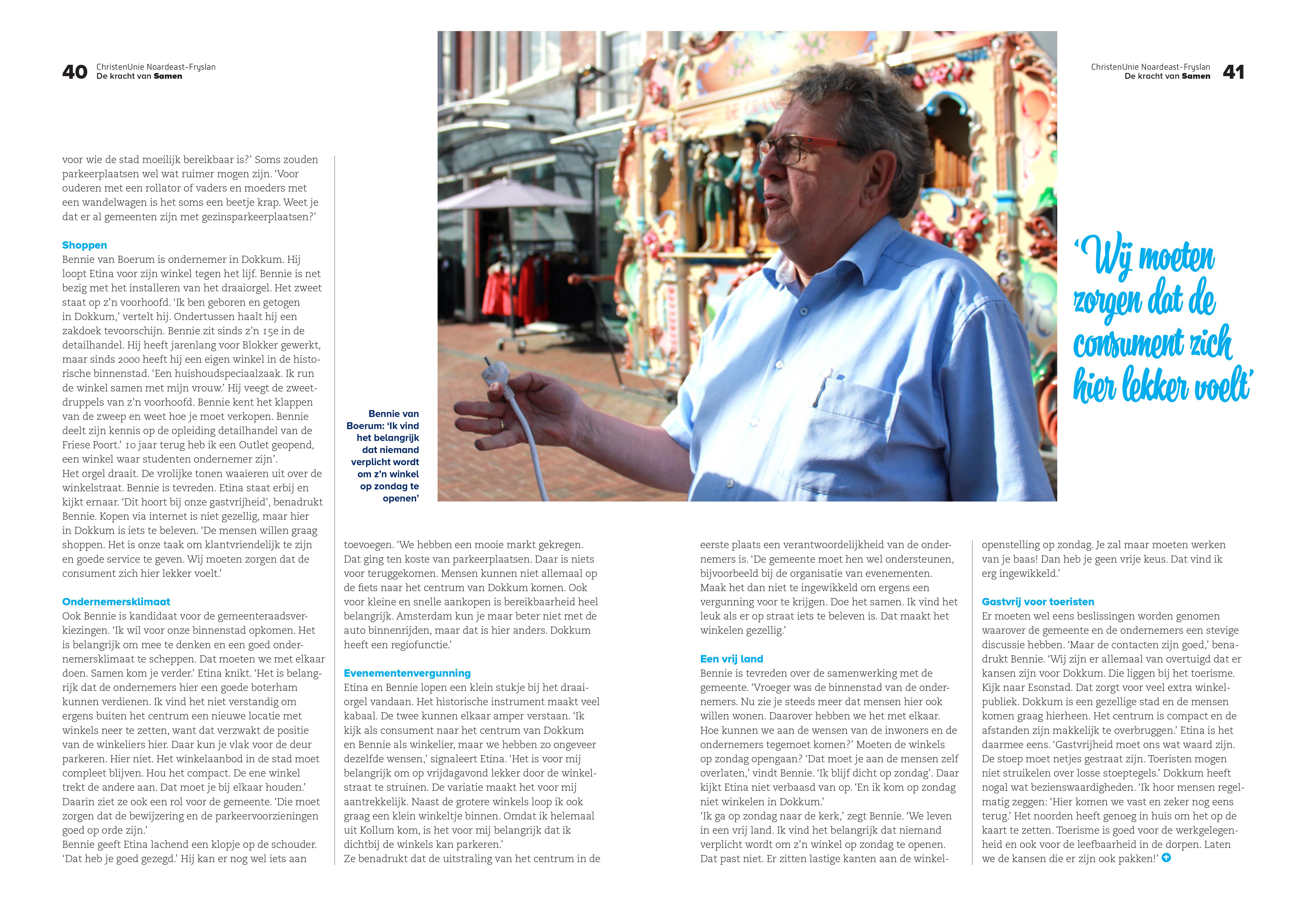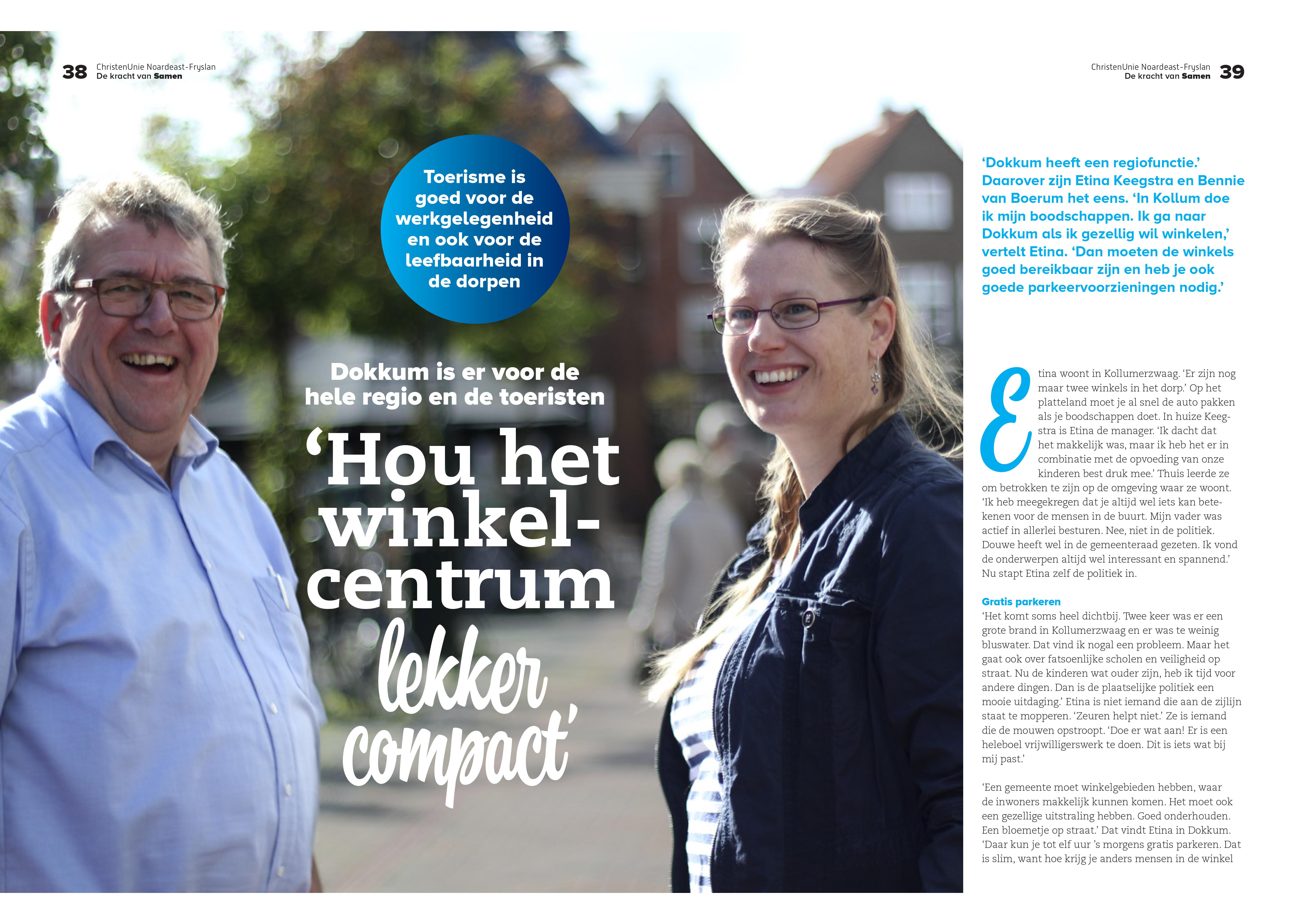 "Hou het winkelcentrum lekker compact." Kandidaat-raadsleden Etina Keegstra en Bennie van Boerum praten in het centrum van Dokkum onder andere over het ondernemersklimaat en de openstelling van winkels op zondag.