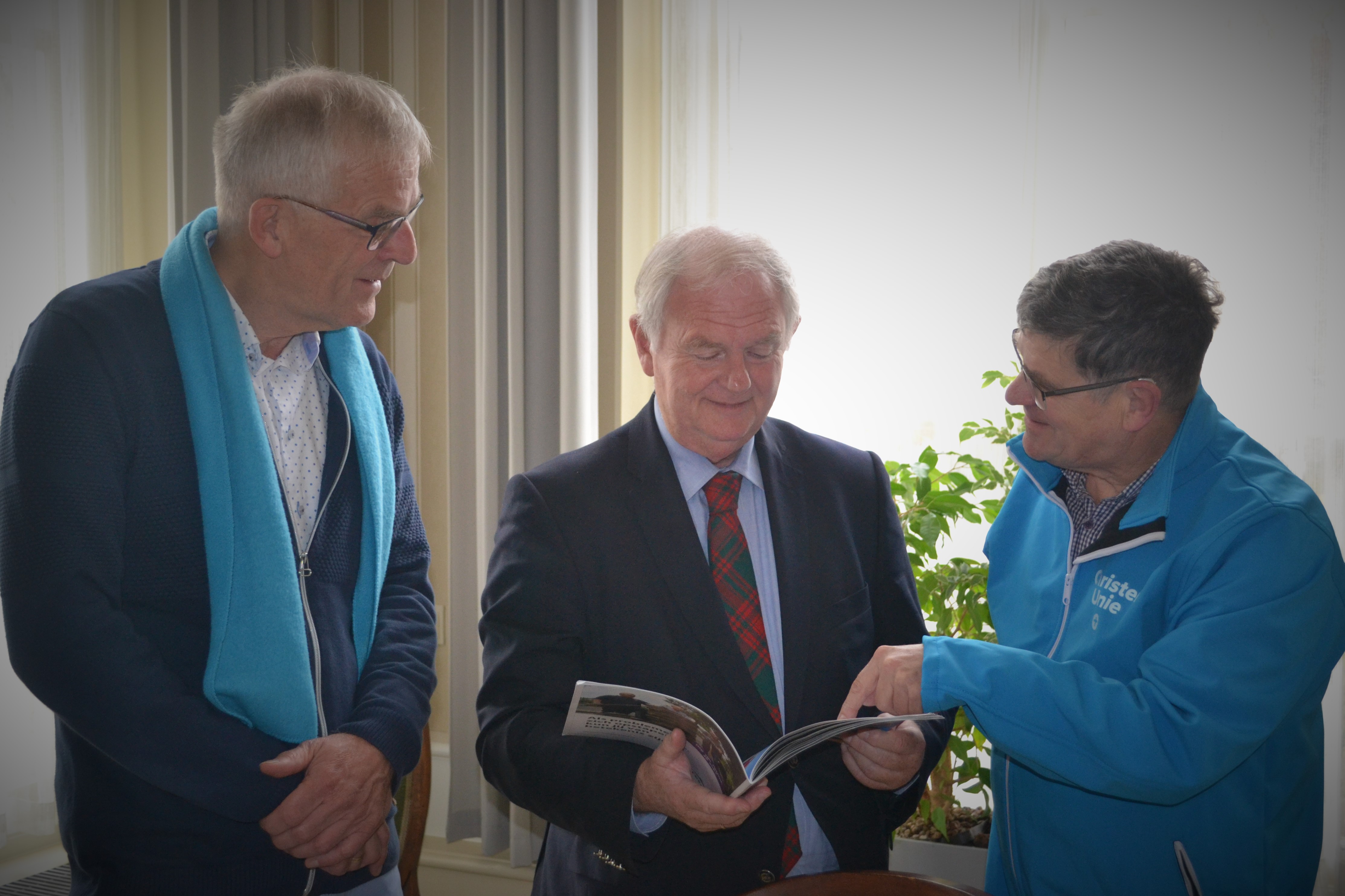 Voorafgaand aan de overhandiging vond een geanimeerd gesprek plaats tussen de burgemeester en de drie vertegenwoordigers van de ChristenUnie Noardeast-Fryslân: kandidaat-raadslid Jan Jarig van der Tol, campagneleider Pieter Sijtsma en het werkgroeplid Lubbert van Dusschoten over diverse zaken waar de nieuwe gemeente mee te maken krijgt. Een punt van grote zorg was hoe het komt met de jeugdzorg. Burgemeester van den Berg sprak zijn grote waardering uit over de visie van de ChristenUnie over Noardeast-Fryslân en wenste ons veel succes toe bij de komende verkiezingen. Hij zei toe de glossy goed te zullen doornemen.