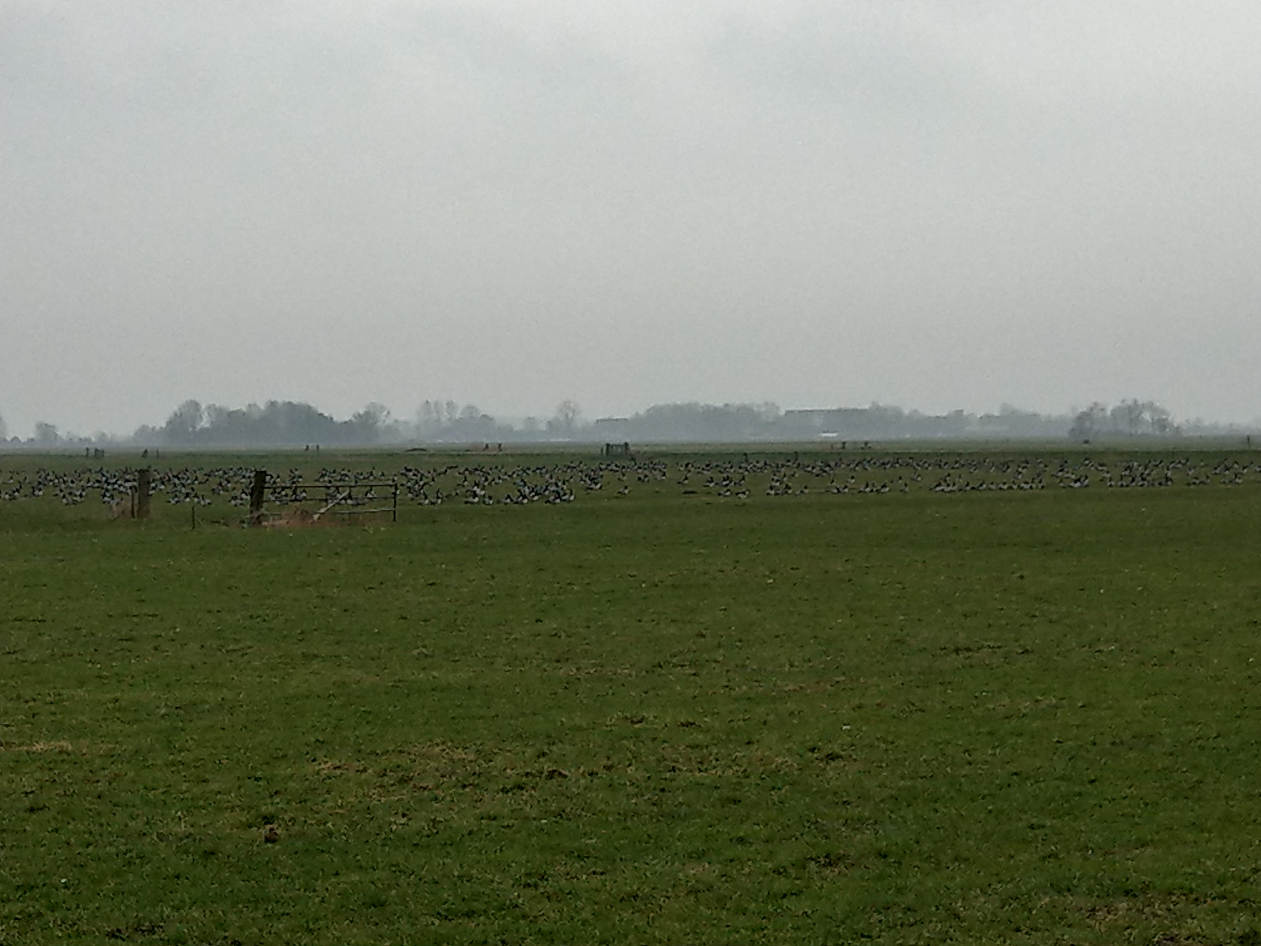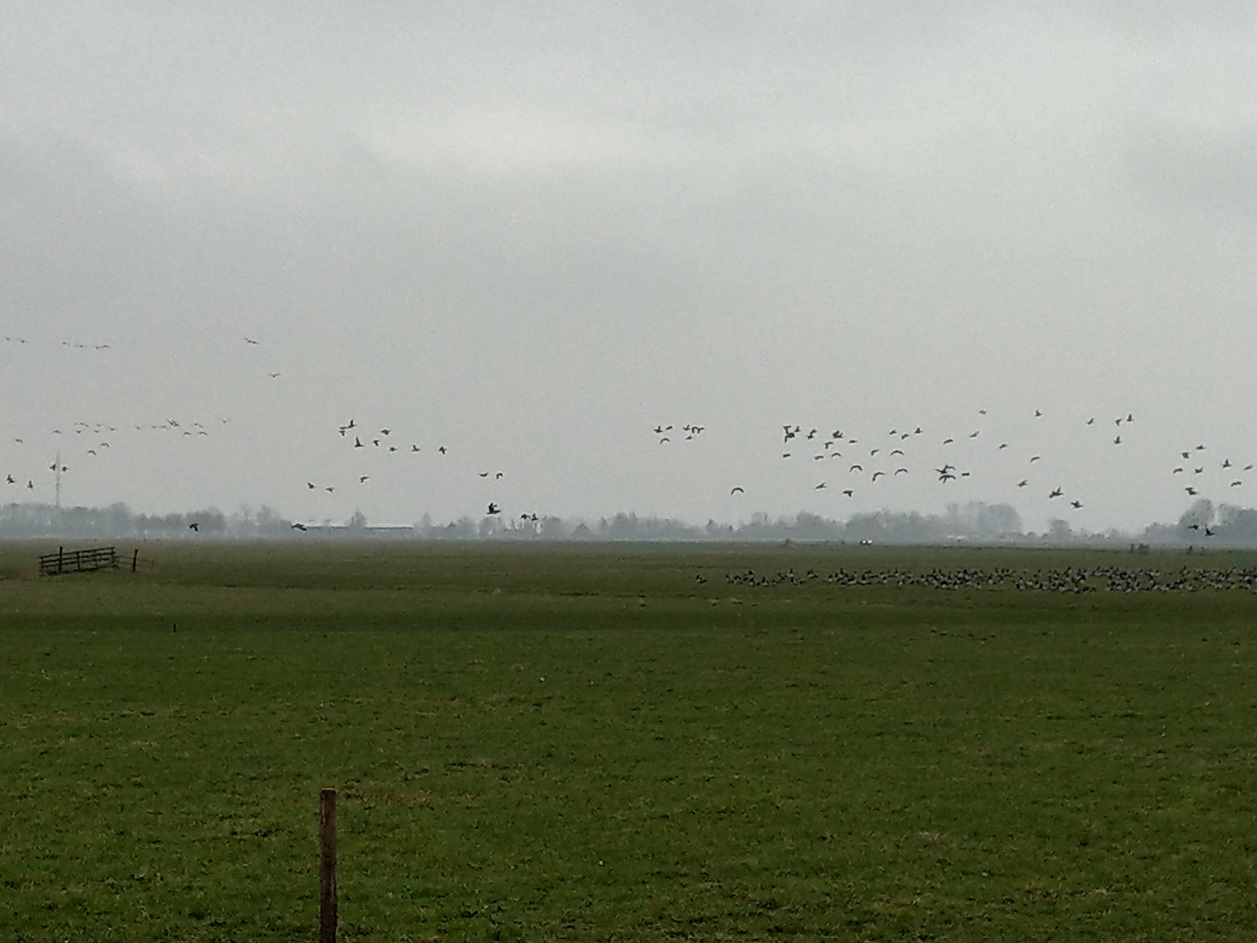 Ee. Licht bewolkt. Vrij uitzicht en grote groepen ganzen in de weilanden. Op weg naar nieuwbouwplannen ligboxenstal familie Keegstra aan de Tibsterweg.